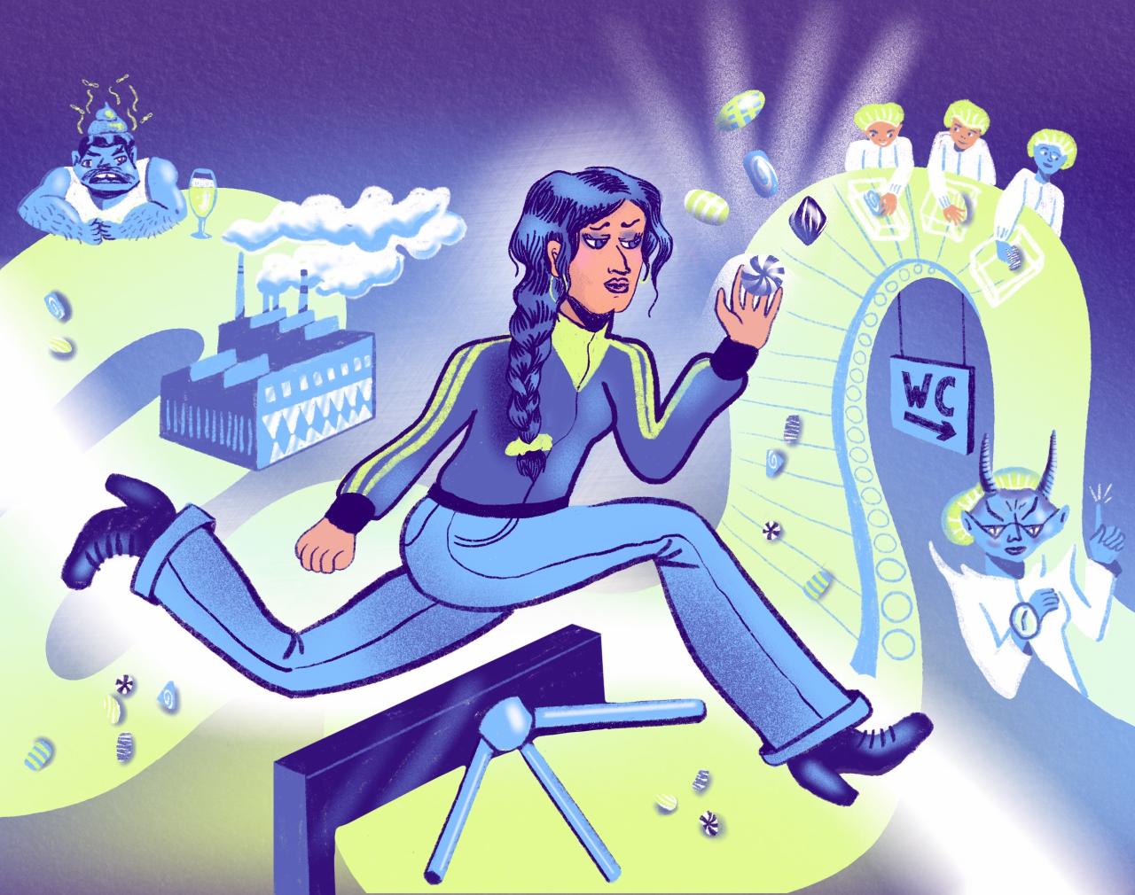Ihre Erfahrungen in der Welt der Gastronomie waren bisher bescheiden. In einem der szene-linken Cafés der Stadt begann sie nur zu arbeiten, weil sie keinen Bock mehr auf die aufgeblasenen Macho Yugos hatte. Dieses selbstorganisierte Establishment zahlte Sanja Mindestlohn, wobei das Trinkgeld in die Vereinskasse floss. Dieses Geld wurde für die Weiterbildung der Vereinsmitglieder aufgewendet. Welche trotz kritischer Männlichkeitskurse Sanja im Suff angeschrien und wie Scheiße behandelt haben. Sie startete einen Betriebsrat mit anderen migrantischen Kellnerinnen und wurde einige Wochen später unter dem Vorwand, sie würde beim Trinkgeld schwindeln, einfach entlassen. „Macho-Yugos oder pseudo-politische Švabo-Macker: gleicher Dreck.“ Denkt sie, als sie ihren Ausweis um 07:17 stempelt. Sie eilt zur Umkleide, zieht sich um und ignoriert, dass sie heute am Morgen noch gar nicht auf der Toilette war. Jetzt steht sie also da. In der „Kette“. Ganz in Weiß, nur das haarnetzartige Teil auf ihrem Kopf leuchtet grün. Und sie muss dringend pinkeln. Außerdem muss Sanja die vor ihr liegenden Bonbons nach Farbe sortieren und sie so, wie für die Verpackung vorgesehen, ausrichten.