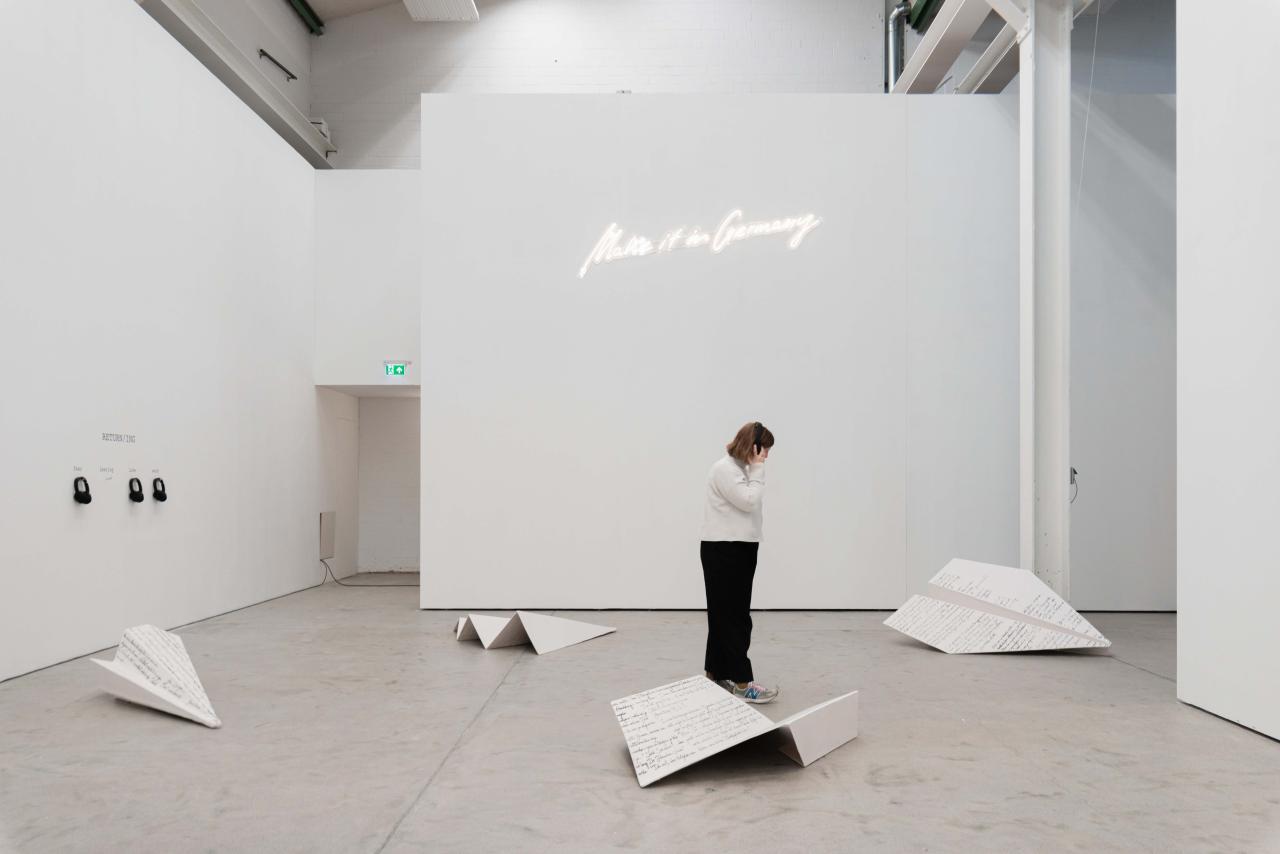 The resulting project 'Return/ing' (2023) is a compilation of conversations with individuals about their experiences, hopes, and fears related to the idea of returning. The project reveals that the concept of returning is complex and multifaceted, with some viewing it as a political act, and others as a desire that may never be realized. 'Return/ing’ includes a sound work divided into four topics (Fear, Work, Leaving, Love), accompanied by heavy and immobile sculptures in the form of giant paper planes, spread across the exhibition space as if they were thrown by a giant hand. Each sculpture is covered in handwritten transcripts, creating the impression of a message left behind by someone. The selection of transcripts offer a glimpse into personal stories, highlighting shared concerns and overlapping perspectives among the interviewees.