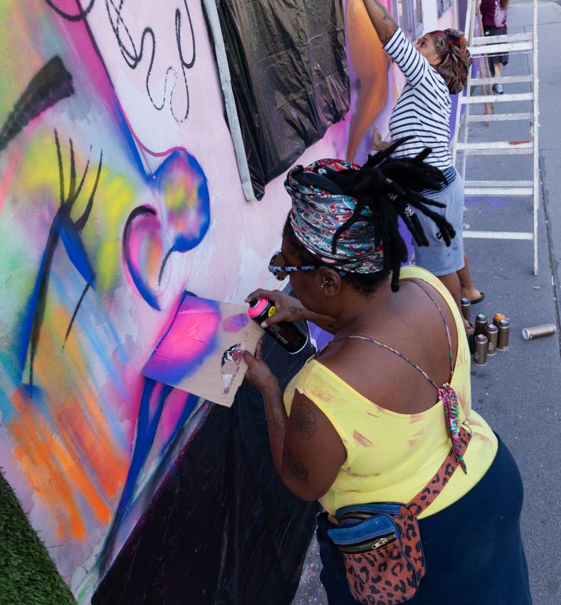 Fue a esta misma ciudad, lejana de la gracia de la urbe moderna, revuelta y engrasada, que fueron invitadas tres artistas del Sur mulheres, pretas, lésbicas. Por un lado, Nené Surreal y Anni Ganzala artistas visuales en el arte del grafiti y el mural urbano. Nené, artista callejera con más de 20 años vomitando sobre la rua paulista trajo con sus diseños la reflexión sobre el sufrimiento y a la vez resistencia de las mujeres negras. Anni, con una currícula enfocada en la temática del amor a lxs ancestrxs, entre la comunidad afrodescendiente, y la identidad de la diáspora africana. Ambas acompañadas de Luana Hansen (ft Dj Mozão), rapera y activista contestataria contra la violencia de la población negra, femenina y lésbica en Brasil.