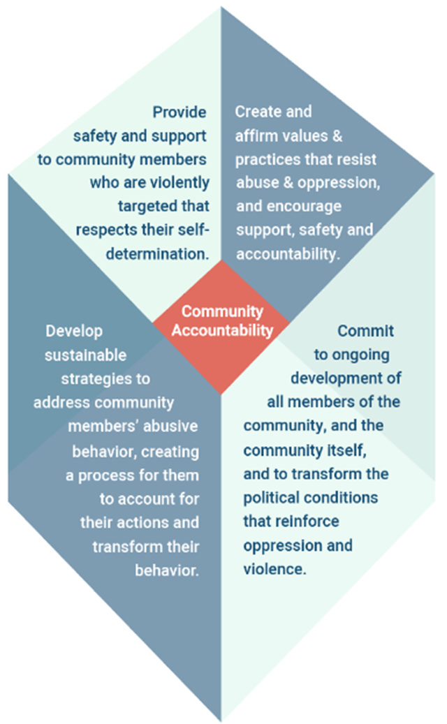 Community accountability also emphasizes that everyone in a community (a group of friends, religious group, house project, political organization, sports team) has a responsibility to address violence. We often want to give up that responsibility to the state or to professionals (therapists, advocates) because we feel unprepared, exhausted, or afraid of making mistakes. While liberation-oriented professionals have a role to play in a community accountability process, we have to recognize that each of us has a role to play, too. And community members can often be more effective at creating change than people who come in from outside a community.