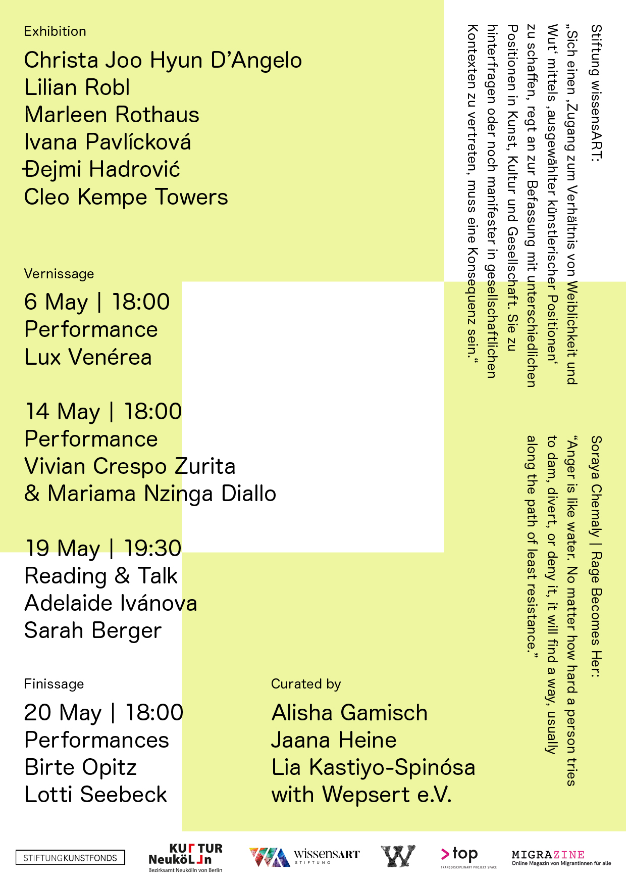 Initiiert wird die Ausstellung von Wepsert e.V. (feministisches Onlinemagazin und gemeinnütziger Verein zur Förderung von Frauen und nicht-binären Menschen in Kultur und Literatur) in Zusammenarbeit mit Alisha Gamisch (Autorin und Vorstandsmitglied von Wepsert e.V.), Jaana Heine (Kunstwissenschaftlerin und Ausstellungsproduzentin), Lia Kastiyo-Spinósa (Künstlerin und Redakteurin bei Migrazine) und Migrazine (Online Magazin von Migrant:innen für alle).